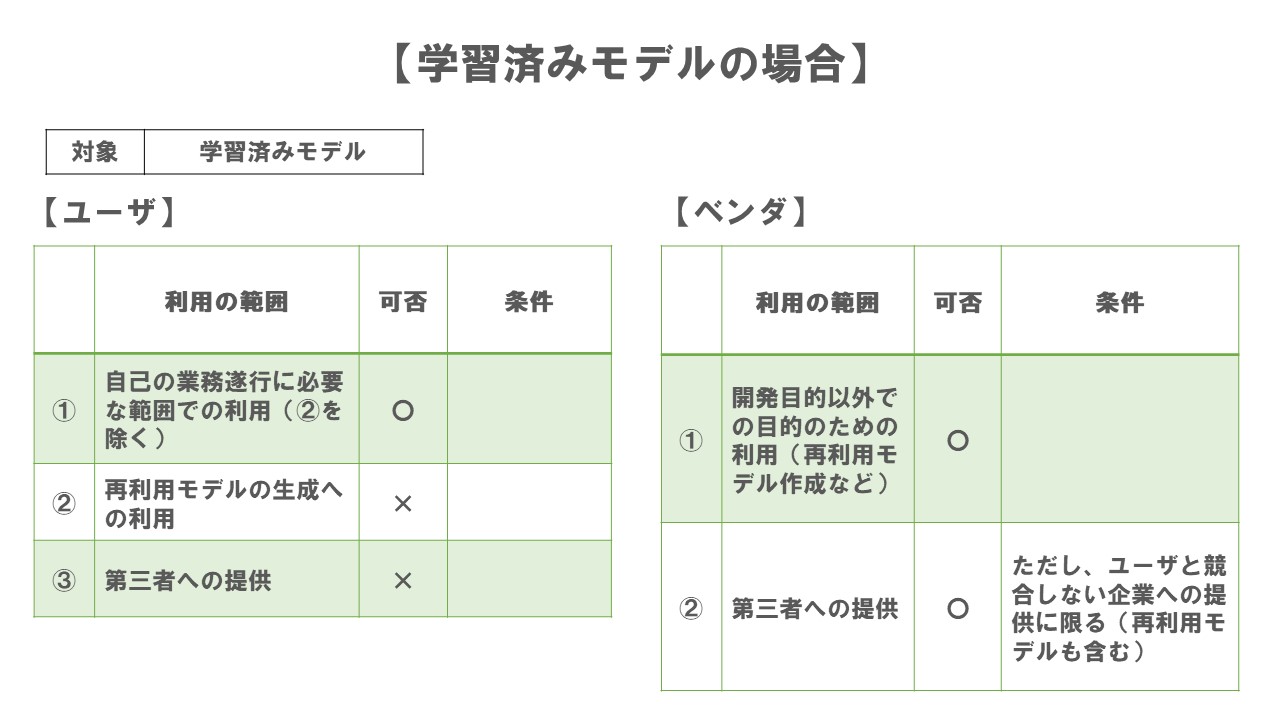 - ベンダとユーザは学習済みモデルを自社の業務に必要な範囲で利用することができる