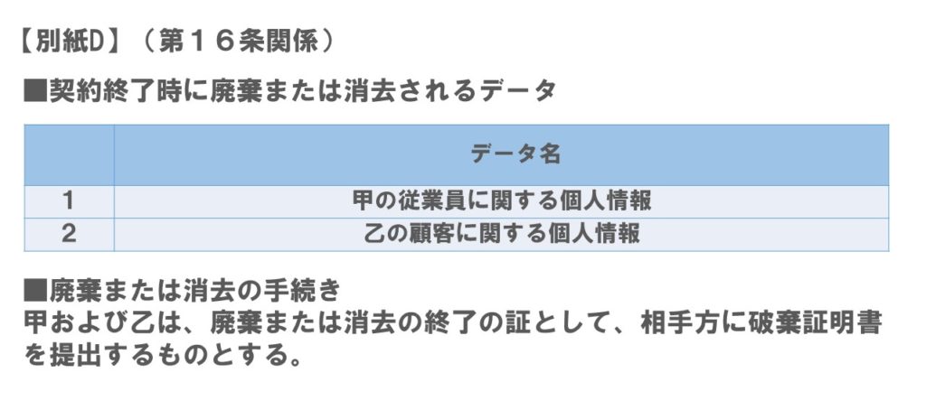 1.甲および乙は、本契約が終了したときは、別紙Dにおいて契約終了時におけるデータの廃棄または消去が明記されたものについて、別途甲および乙で定める手続に従い、速やかに廃棄または消去する。
