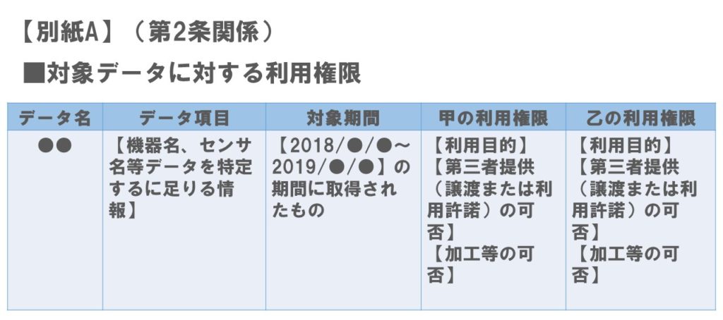このように「誰のものか」を決めることができない代わりに、利用権限として、データごとに誰がどのような範囲・方法で利用することができるかを定めて、契約の当事者を拘束しているのです。
