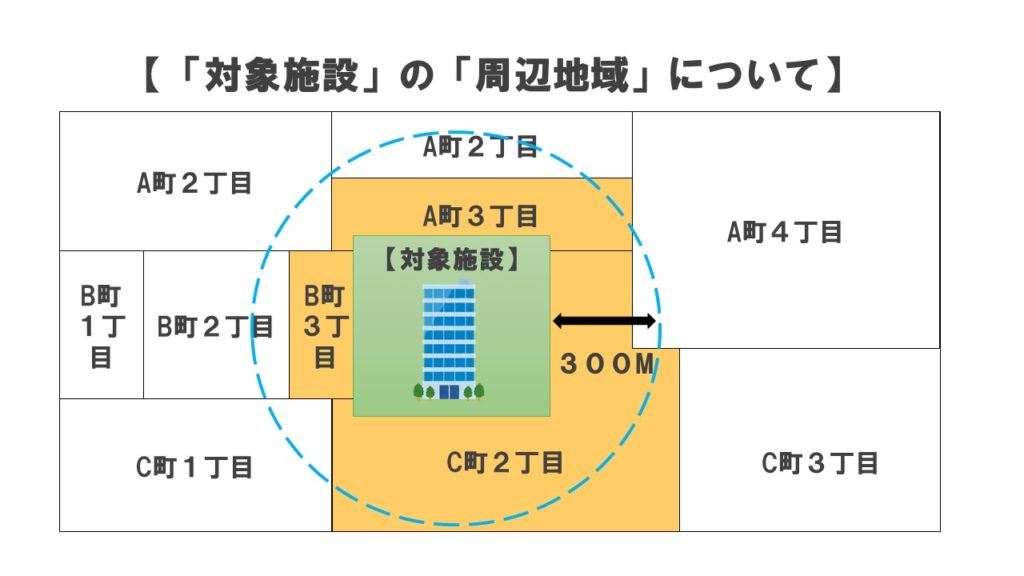 図のように、「対象施設」から半径300m以内であっても、A町2丁目のように「周辺地域」とされない場所や、反対に、C町2丁目のように、「対象施設」から半径300m外でも「周辺地域」とされる場所があります。