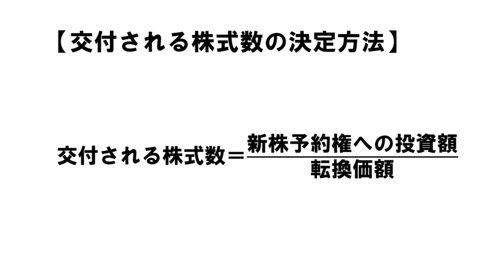この場合、投資家Aに交付される株式数は1000万円(新株予約権への投資額)÷1万円(転換価額)という計算式で算出されることになります。その結果、投資家Aに交付される株式数は、1000株ということになります。