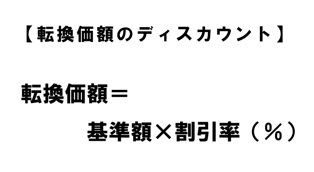 上記の例を使って見ていくと、投資家Dは1株あたり1万円の株価で投資をしているため、基準額は1万円になります。この時に、割引率を20%とすると、投資家Cの転換価額を算出する計算式は、「基準額×0.8」となり、投資家Cの転換価額は1株あたり8000円となります。