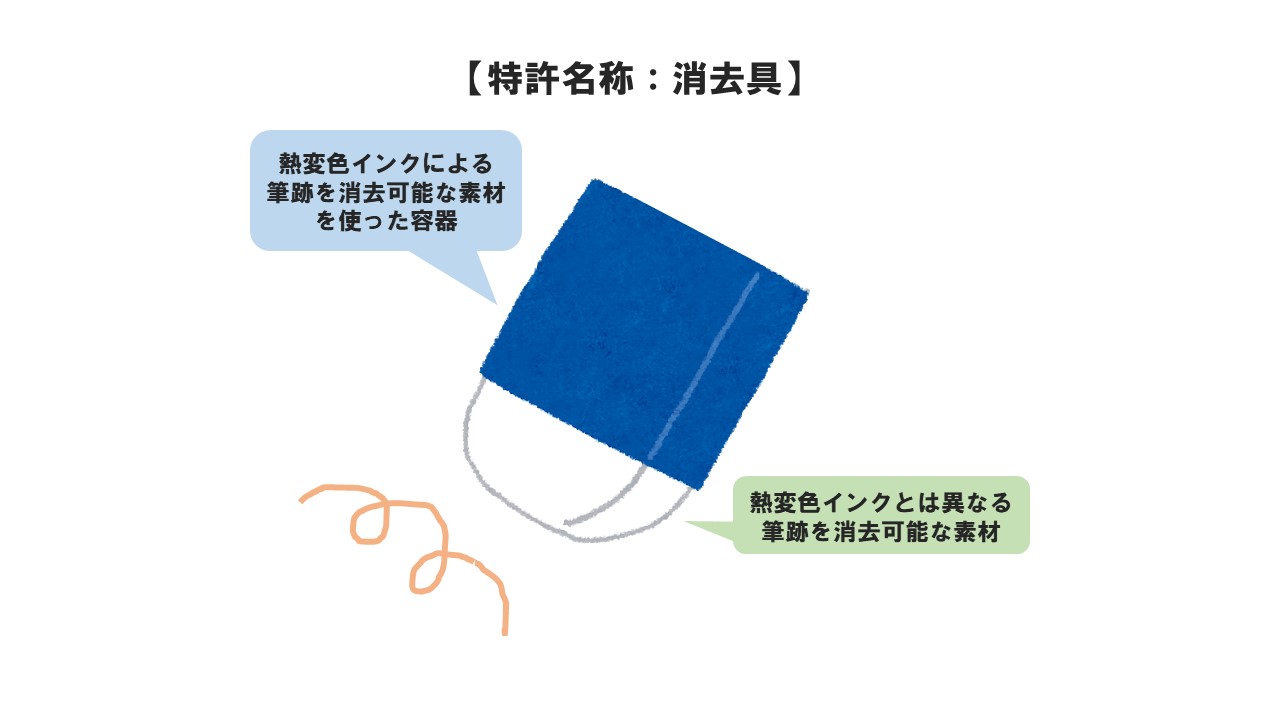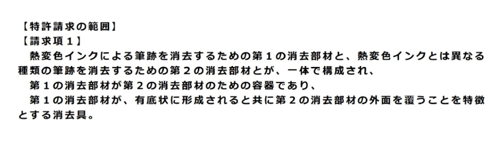 この構成要素①~③に合致する消しゴムを特許権者である三菱鉛筆株式会社ではない他社が無断で生産したり、販売したりすると特許権侵害になります。