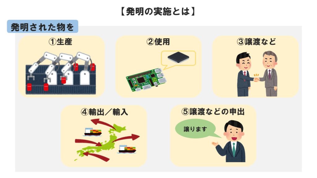 また、上の図に加えて新たに発明された生産方法を使用したり、新たに発明された生産方法に基づいて生産された物を使用、譲渡など、輸出、輸入、譲渡などの申し出を行ったりすることも「実施」に含まれています。