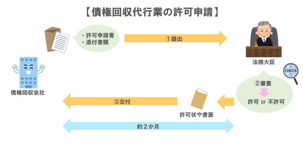 - 債権回収代行業の許可申請の流れは、①債権回収会社による書類の提出、②法務大臣の審査、③許可状の交付となる