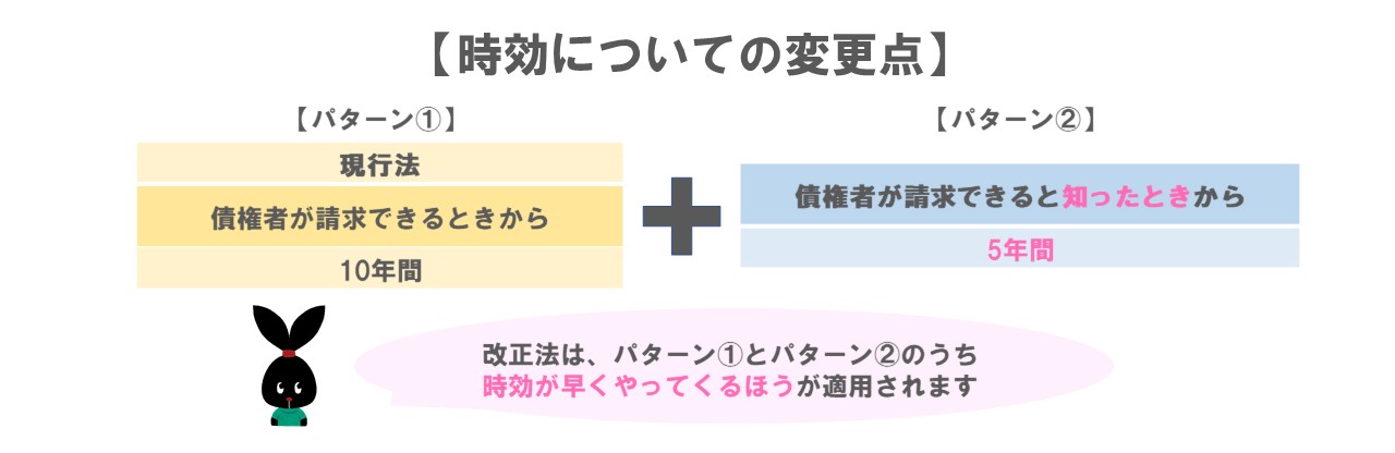 民法改正後の時効制度は、現行法の債権者が請求できるときから10年というパターン①に、債権者がお金を請求できると知ったときから5年間というパターン②が追加されます。債権者には、パターン①とパターン②のうち、早く時効がやってくるほうが適用されることになります。