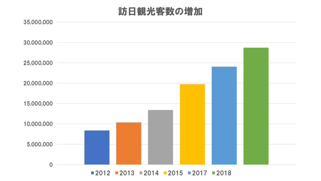 以下の図からもわかるように、近年、インバウンド(訪日観光客)が急激に増加しています。