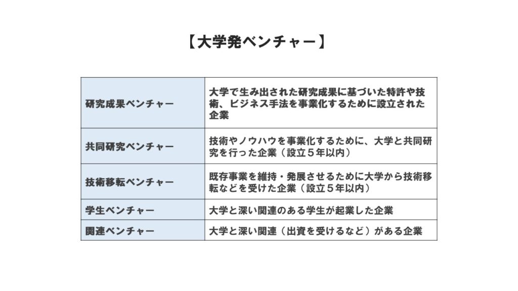 - 「大学発ベンチャー」とは、大学の研究成果を事業化するために設立された企業や、大学と共同研究を行っている企業など、大学とゆかりのあるベンチャー企業のことをいう