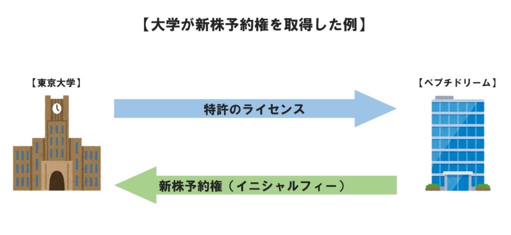 東京大学は、以下の図のようにペプチドリームから新株予約権を取得しました。