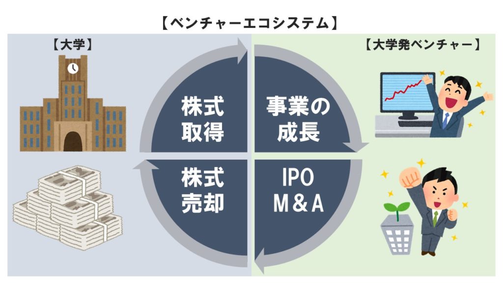「ベンチャーエコシステム」とは、大学発ベンチャーが研究成果を実用化し、IPO(新規上場)やM&A(企業の合併や買収)をした際には、その利益が株式・新株予約権を取得した大学にも流れ、大学による次の大学発ベンチャーへの支援(株式取得)に繋がるというシステムのことをいいます。