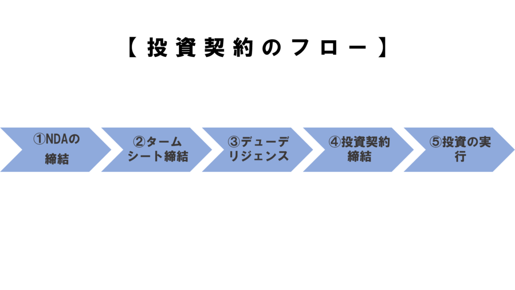 • 投資のフローは①NDAの締結、②タームシートの締結、③デューデリジェンス、④投資契約の締結、⑤投資の実行となっている