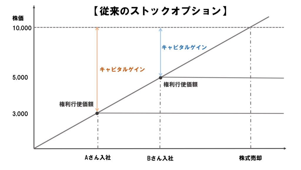 このように、従来のストックオプションは、付与のタイミングによって、権利行使価額と得られるキャピタルゲインに大きく差が生まれる可能性があるため、特に、スタートアップなどのように急成長を目指す企業では、ストックオプションを付与された者の間で不公平感を生むおそれがあります。