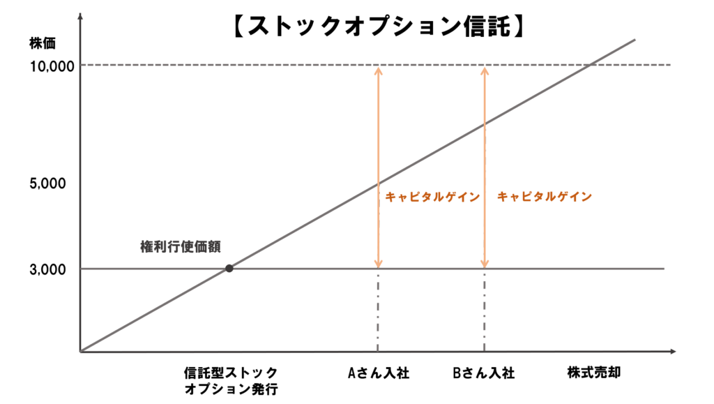以下は、ストックオプション信託におけるキャピタルゲインを図にしたものです。