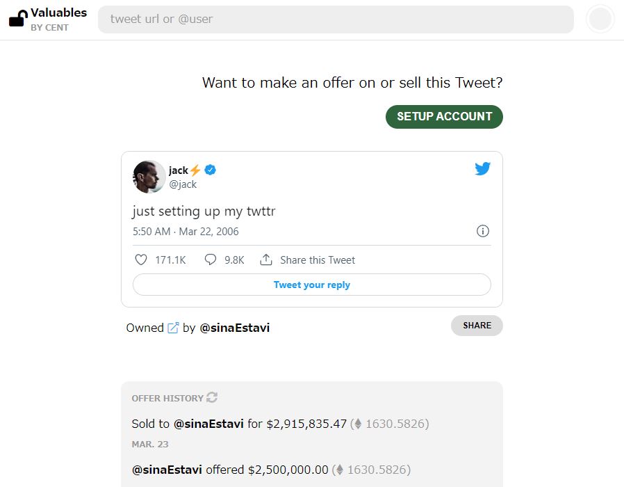 以下のサイトは、ジャック・ドーシー氏の最初のツイートがオークションされた、Valuables By Centの当該ツイートの画面です。