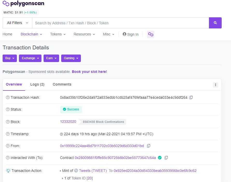 リンク元:https://polygonscan.com/tx/0x8ad39b10f26e2da972a833edbb1cdb25af476fefaaa77e4ceda033e4c9ddf264