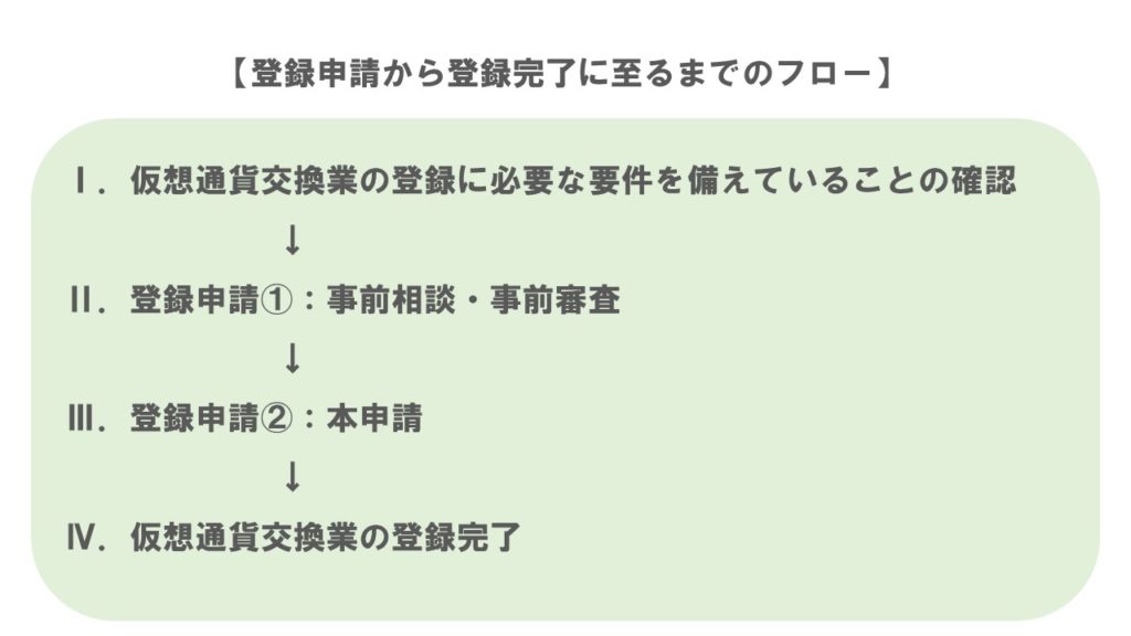 以下は、仮想通貨交換業の登録を申請し、登録が完了するまでのフローです。