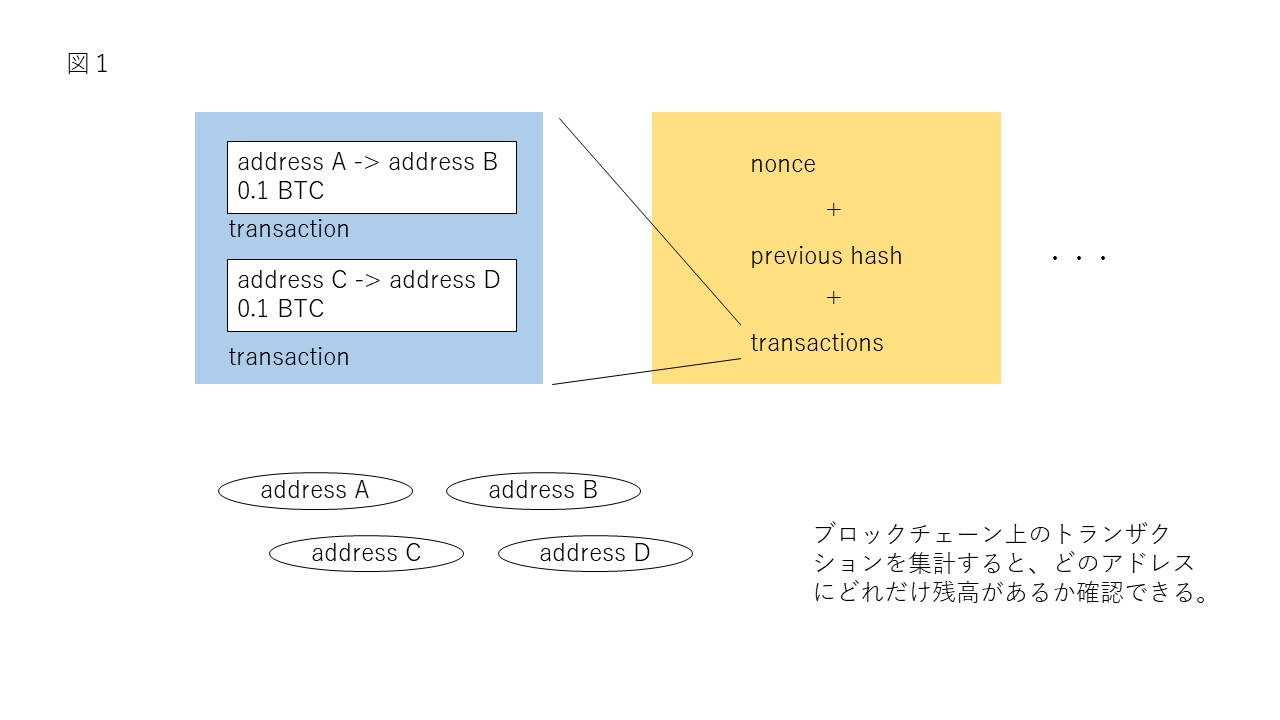 ビットコインのブロックチェーンシステムは、以下の図ように、どのアドレスからどのアドレスにどれだけの残高が移転したかの情報(transaction)を保有します。マイニングによって最初にビットコインが発生してから、誰に対して移転したのかの全ての情報がブロックチェーンに書き込まれているので、ブロックチェーンを参照すると、各アドレスにどれだけのビットコインが帰属しているかが分かります。