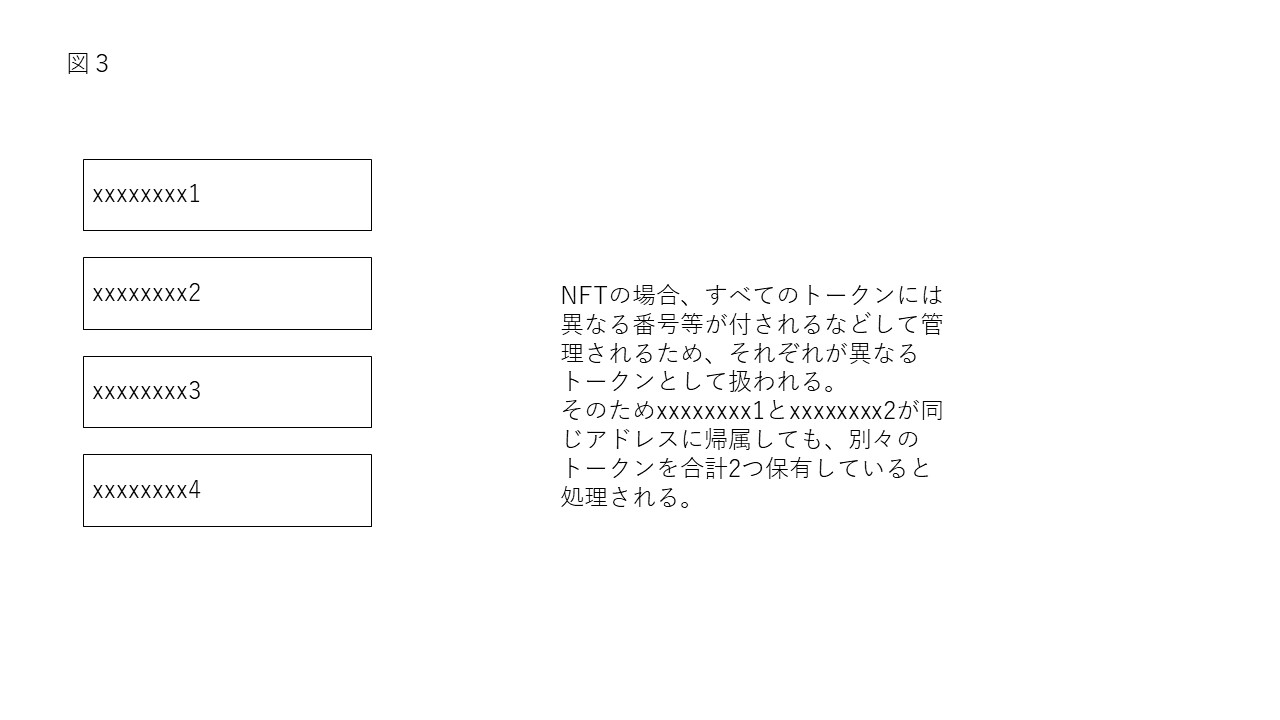 NFTの場合、すべてのトークンには異なる番号等が付されるなどして管理されるため、それぞれが異なるトークンとして扱われます。